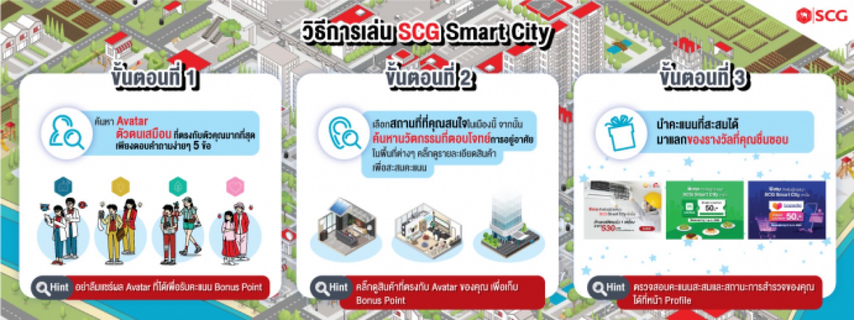 เอสซีจี ชวนทุกคนออกเดินทางสำรวจเมืองจำลองในรูปแบบ Gamification พร้อมเรียนรู้นวัตกรรมสินค้า และโซลูชันจาก SCG ที่จะช่วยตอบโจทย์ความต้องการของไลฟ์สไตล์ในปัจจุบัน ภายใต้พื้นที่ใช้สอยที่แตกต่างหลากหลายและนำมาต่อยอดเป็นแรงบันดาลใจในการสร้างบ้านในฝัน อีกทั้งยังสามารถสะสมแต้ม เพื่อแลกสิทธิประโยชน์ และรางวัลต่างๆ ตั้งแต่วันนี้ คลิก